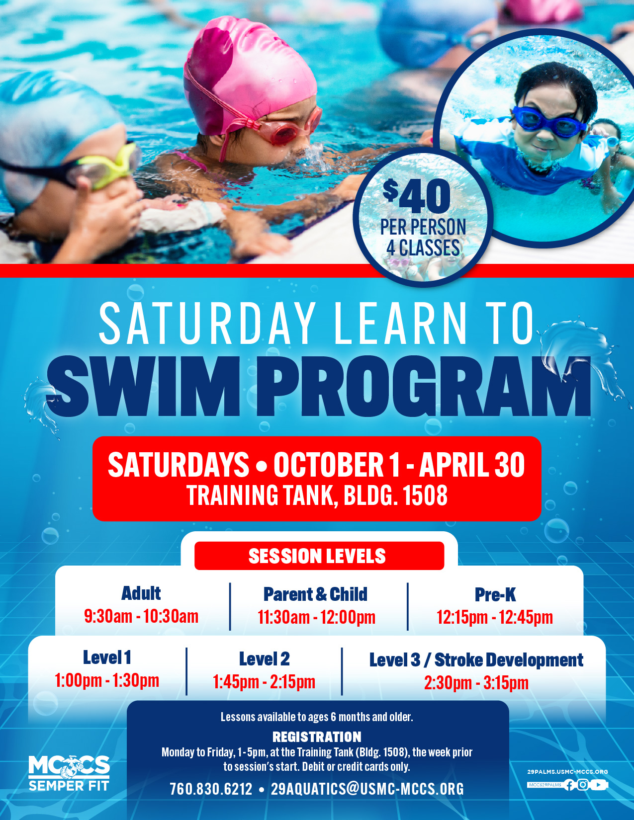 Swim lessons for ages 6 months and older.