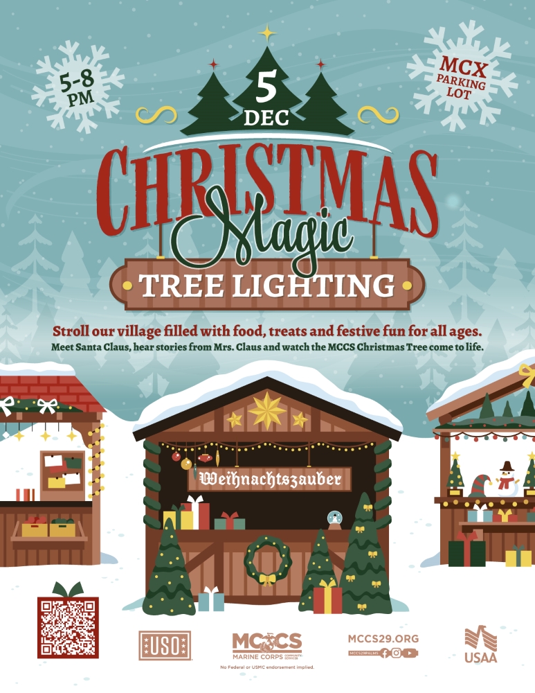 Stroll our village filled with a trail of twinkling lights, the sweet voices of carolers and 12 booths of wonder. Enjoy food, treats and festive fun for all ages, ending with a very special lighting of the MCCS Christmas tree.