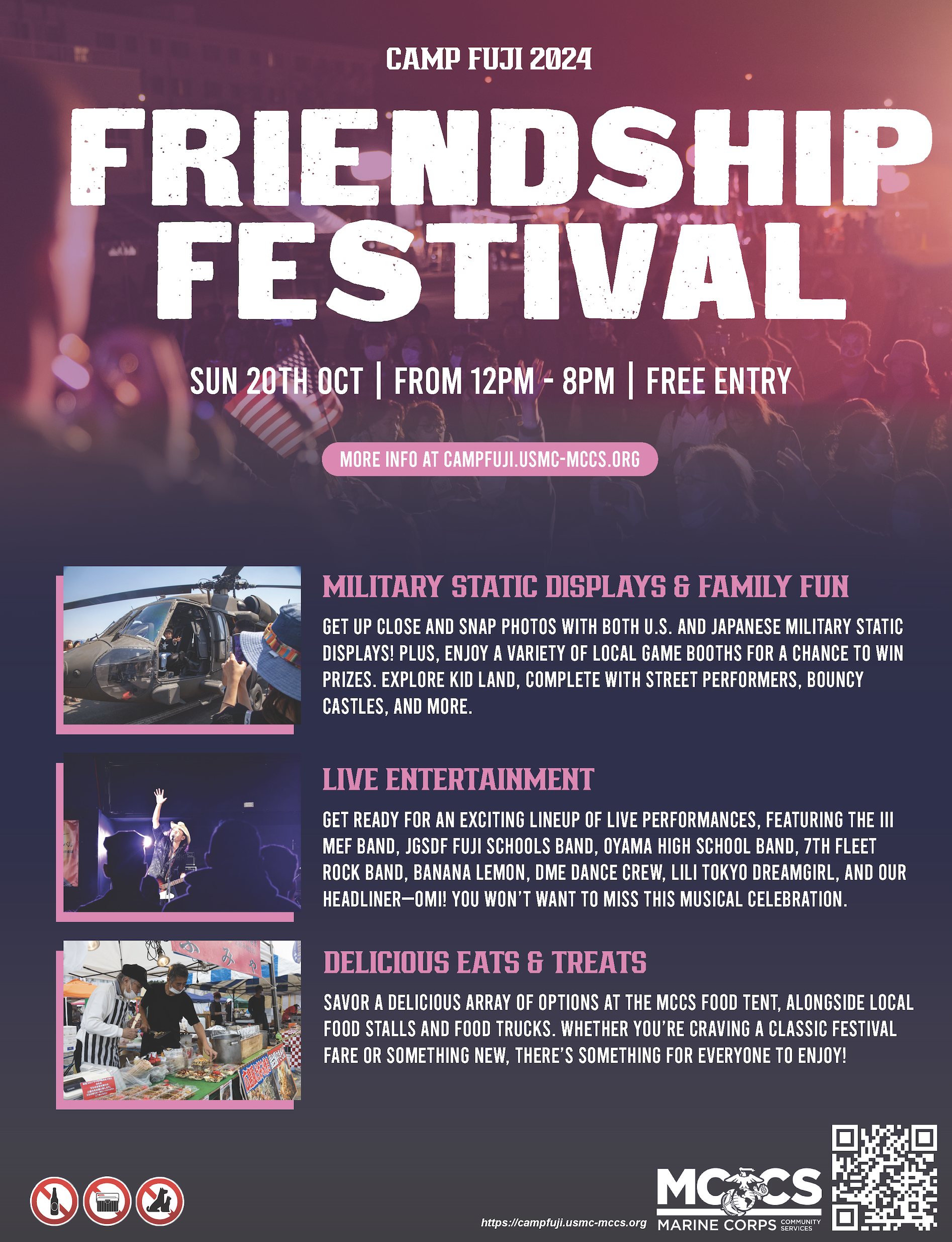 Phone: 0550-88-5856Come join us for a fun filled day at the Camp Fuji Friendship Festival on Sunday, October 20, from noon to 8 p.m.! Enjoy live entertainment, delicious food, military static displays, game booths, a play area for kids and more. This event is free and open to SOFA personnel and local residents.