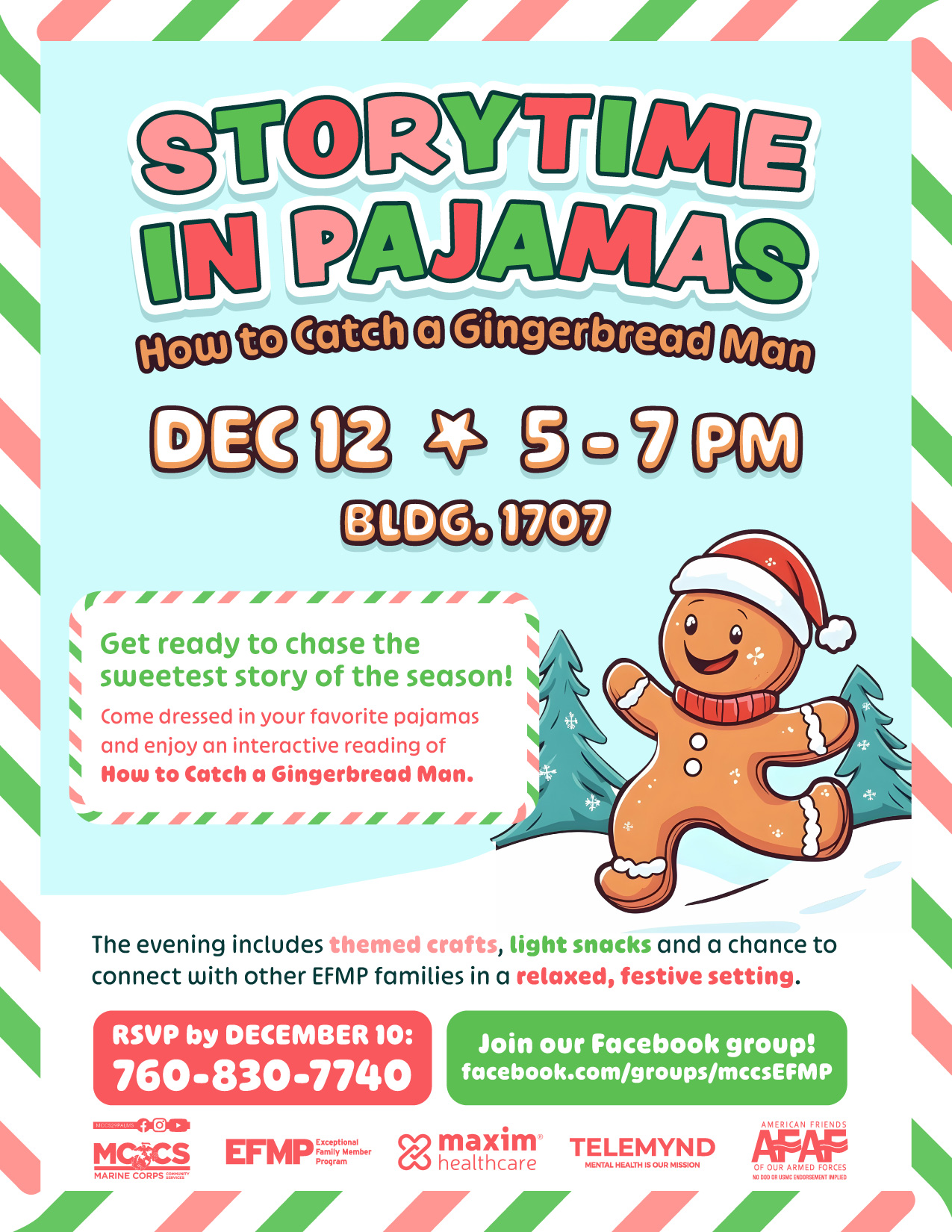 Come dressed in your favorite pajamas and enjoy an interactive reading of How to Catch a Gingerbread Man. The evening includes themed crafts, light snacks and a chance to connect with other EFMP families in a relaxed, festive setting.