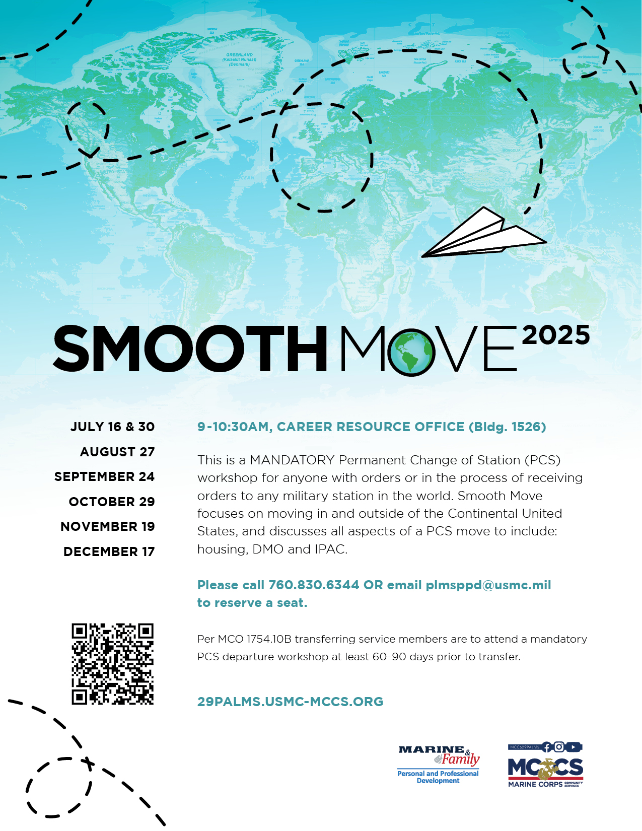 This is a MANDATORY Permanent Change of Station (PCS) workshop for anyone with orders or in the process of receiving orders to any military station in the world. Smooth Move focuses on moving in and outside of the Continental United States, and discusses all aspects of a PCS move to include: housing, DMO and IPAC.